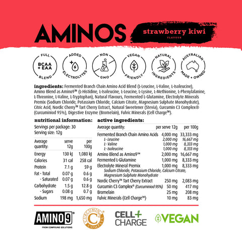 Fermented Branch Chain Amino Acid Blend (L-Leucine, L-Valine, L-Isoleucine), Amino Blend as Amino9™ (L-Histidine, L-Isoleucine, L-Leucine, L-Lysine, L-Methionine, L-Phenylalanine, L-Threonine, L-Valine, L-Tryptophan), Natural Flavours, Fermented L-Glutamine, Electrolyte Minerals Premix (Sodium Chloride, Potassium Chloride, Calcium Citrate, Magnesium Sulphate Monohydrate), Citric Acid, Nordic CherryTM Tart Cherry Extract, Natural Sweetener (Stevia), Curcumin C3 Complex® (Curcuminiod 95%), Digestive Enzyme (Bromelain), Fulvic Minerals (Cell Charge™).