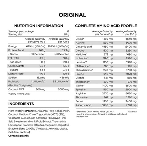 - Made with a blend of peanut, pea, rice and faba proteins for complete amino acid balance