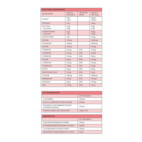 Soluble Maize Fibre, L-Glutamine, Natural Flavour, Mineral Salts (Calcium Citrate, Sodium Chloride, Magnesium Citrate, Potassium Chloride), Acidity Regulator (Malic Acid), Anti-Caking Agent (Silicon Dioxide), Acetyl-L-Carnitine Hydrochloride, Seaweed (Lithothamnion species), Sweetener (Sucralose), Minerals (Zinc Gluconate, Sodium Selenite), Probiotic (Bacillus coagulans), Vitamin B Complex (B3 (Niacin), B5 (Pantothenic Acid), B6 (Pyridoxine Hydrochloride), B2 (Riboflavin), B1 (Thiamin Hydrochloride), B9 (Folic Acid), B7 (D-Biotin), B12 (Cyanocobalamin)), Colour (Carmoisine).