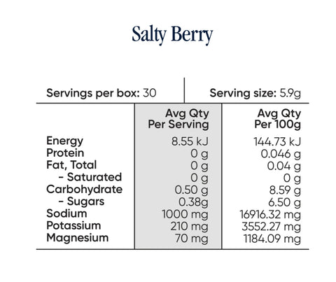 Salty Berry: Sodium chloride (Lake Deborah Salt, Western Australia), magnesium gluconate, citric acid, tartaric acid, natural berry flavour, potassium chloride, silica, organic stevia.