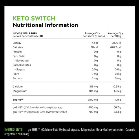 Each capsule contains a precise blend of magnesium and calcium BHB salts, delivering high-quality exogenous ketones in a sodium-free formula. Keto Switch is vegan-friendly, free from gluten, lactose, soy, sugar, artificial colours, flavours, and preservatives—making it a clean and effective option for anyone following a ketogenic lifestyle.