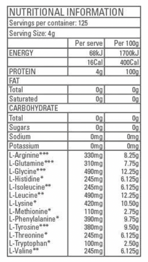 SUGGESTED USE: Mix 4g (1 tsp) of Free Form Amino Acids in 150mL water and consume 20 minutes before, during, after exercise or before bed. Store in a cool, dry, dark place.