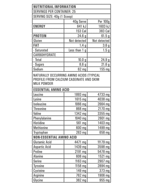 Casein, Skim milk powder, Flavour, Emulsifier (soy lecithin), Natural colour (beta carotene), Sweetener (sucralose).