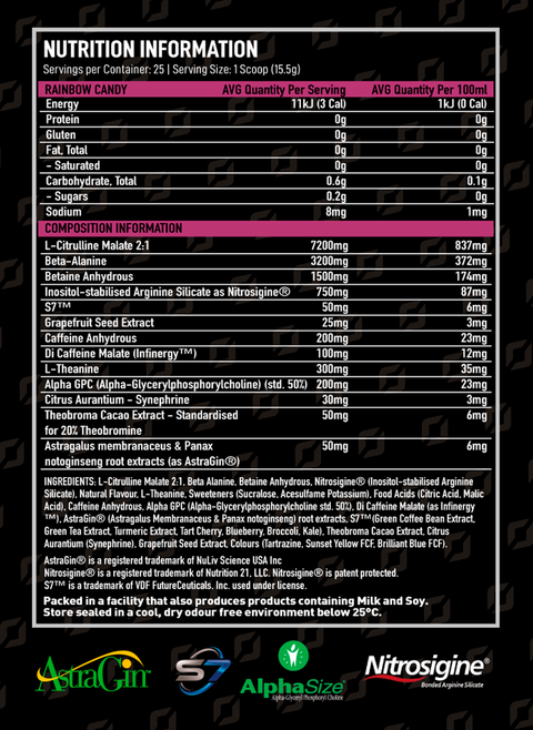 INGREDIENTS: L-Citrulline Malate 2:1. Beta Alanine. Betaine Anhydrous. Nitrosigine® (Inositol-stabilised Arginine Silicate). Natural Flavour, L-Theanine, Sweeteners (Sucralose, Acesulfame Potassium). Food Acids (Citric Acid, Malic Acid), Caffeine Anhydrous, Alpha GPC (Alpha-Glycerylphosphorylcholine std. 50%). Di Caffeine Malate (as InfinergyTM). AstraGin® (Astragalus Membranaceus & Panax notoginseng) root extracts. S7 TM (Green Coffee Bean Extract.