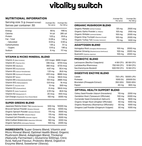 Vitality Switch is a premium, all-in-one super greens powder formulated with 35 nutrient-dense, hand-selected ingredients to help optimise energy, digestion, immunity, and overall vitality. This complete vegan formula combines powerful blends of superfoods, probiotics, adaptogens, and enzymes to support your health and performance naturally.
