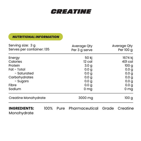 Each serving delivers 3g of pharmaceutical-grade micronised creatine monohydrate — a highly bioavailable form that supports rapid absorption and utilisation. This pure, unflavoured powder contains no fillers, sugars, fats, or additives, ensuring you get clean, effective support to power through intense exercise.