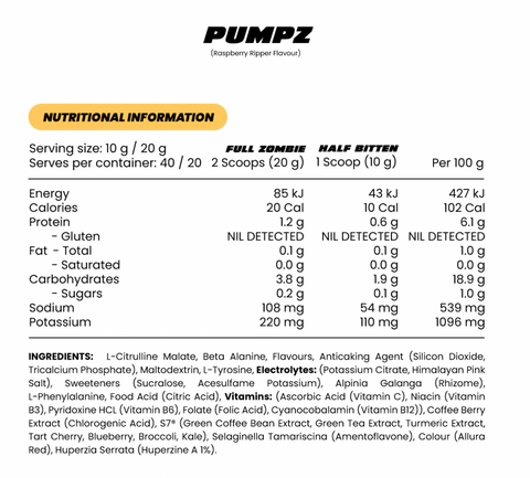 With the best flavour combinations, Zombie Labs Pumpz is available in Raspberry Ripper, Posessed Passion Mango & Undead Unflavoured. So whether you want delicious flavours or a natural unflavoured version the choice is yours.