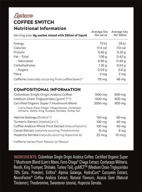 To elevate your mental clarity and focus, Coffee Switch™ features award-winning Alpina Galanga, Coffea Arabica Fruit (NeuroFactor®), Theobroma Cacao, and Huperzia Serrata. To further support energy, gut health, and overall wellbeing, it includes a 5-certified organic mushroom blend, Turmeric, and goMCT® healthy fats derived from coconut oil with prebiotic acacia fibre.