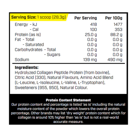 Hydrolysed Collagen Peptide Protein (from bovine), Natural Flavours, Amino Acid Blend (L-Leucine, L-Isoleucine, L-Valine, L-Tryptophan), Sweeteners (955, 950).