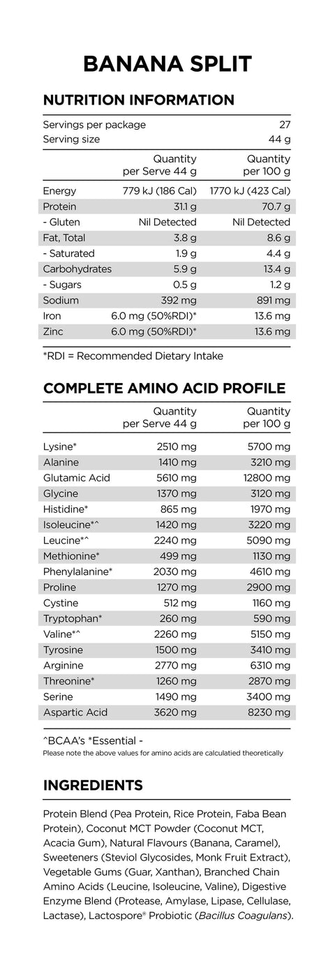 Protein), Coconut MCT Powder (Coconut MCT, Acacia Gum), Natural Flavours (Banana, Caramel), Sweeteners (Steviol Glycosides, Monk Fruit Extract), Vegetable Gums (Guar, Xanthan), Branched Chain Amino Acids (Leucine, Isoleucine, Valine), Digestive Enzyme Blend (Protease, Amylase, Lipase, Cellulase,