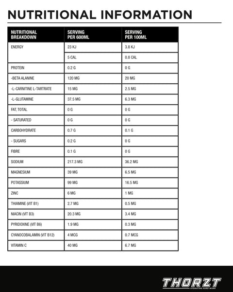 Maltodextrin, THORZT Lemon Lime, Blue Lemonade,Orange, Tropical, Wildberry Flavours, Citric Acid, THORZT Electrolyte Mineral Blend (Magnesium Citrate, Sodium Chloride, Potassium Chloride, Zinc Oxide),THORZT Amino Blend (Beta Alanine, L-Glutamine,L-Carntine, L-Tartrate, BCAA), THORZT Vitamin Blend (Vitamin C, B3, B6, B1, B12), Guar Gum, Sucralose, Colour - Sunset Yellow, Brilliant Blue, Red Ponceau