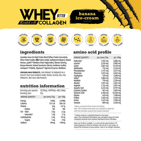 White Wolf’s Whey Better Protein is an ultra premium Australian grass-fed protein blend, enriched with hydrolysed collagen. This best-selling blend has everything needed to support a healthy body and maintain healthier hair, skin and nails. We've also added DigeZyme® digestive enzymes to support proper digestion and LactoSpore® probiotics to promote a healthy gut, reduce bloating and to boost immunity.