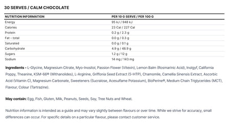 L-Glycine, Magnesium Citrate, Myo-Inositol, Cacao, Passion Flower (Vitexin), Lemon Balm (Rosmarinic Acid), Flavour,
