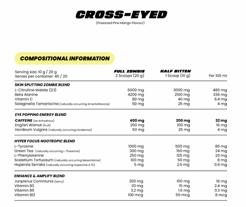 Time to rise from the dead with Zombie Labs Cross-Eyed. What is Cross-Eyed? It is Zombie Labs ultra-high stimulant pre-workout, the strongest pre in their range & here to raise hell. It's for the guys and girls who want more from their pre-workout, extra energy, focus, power and performance.